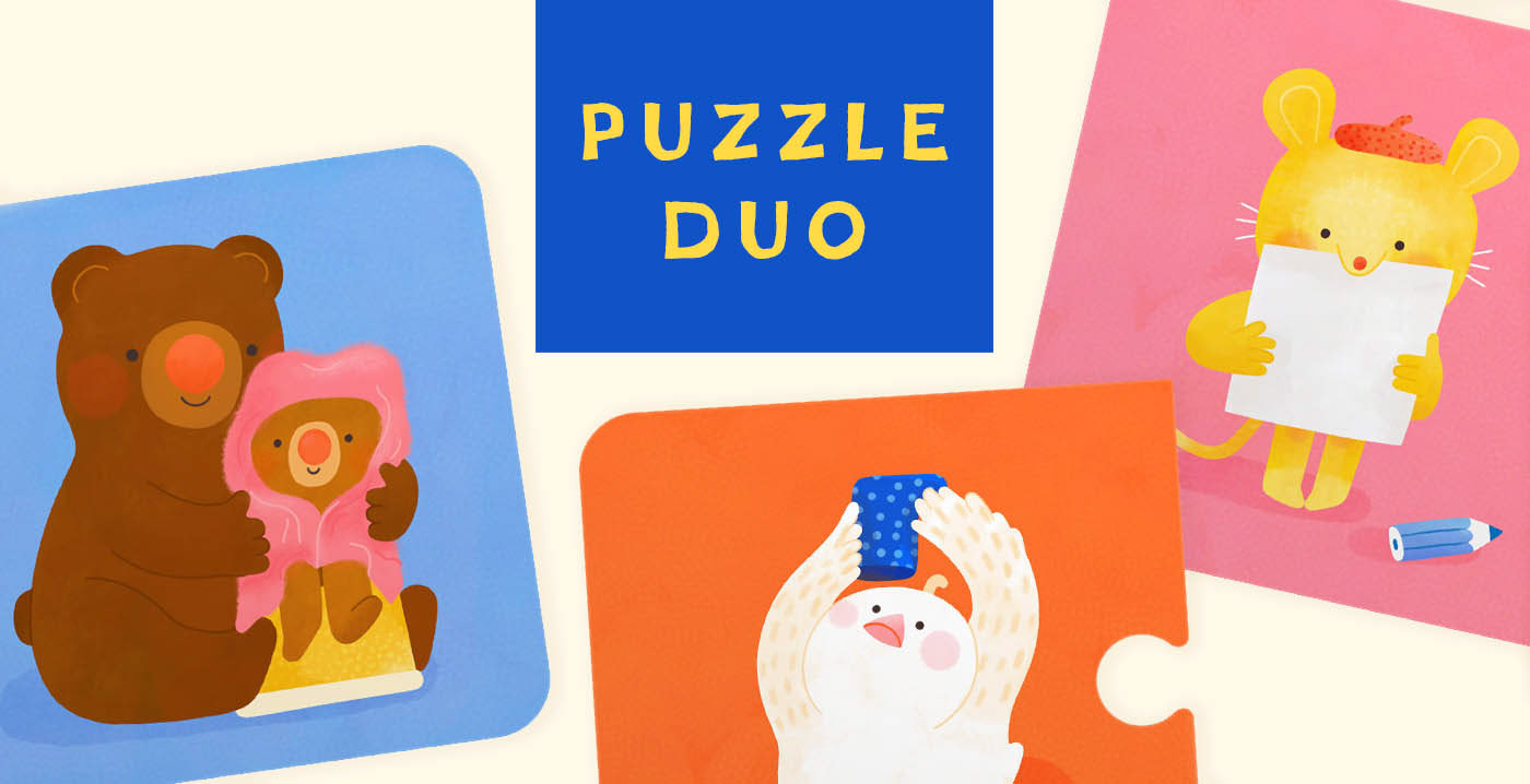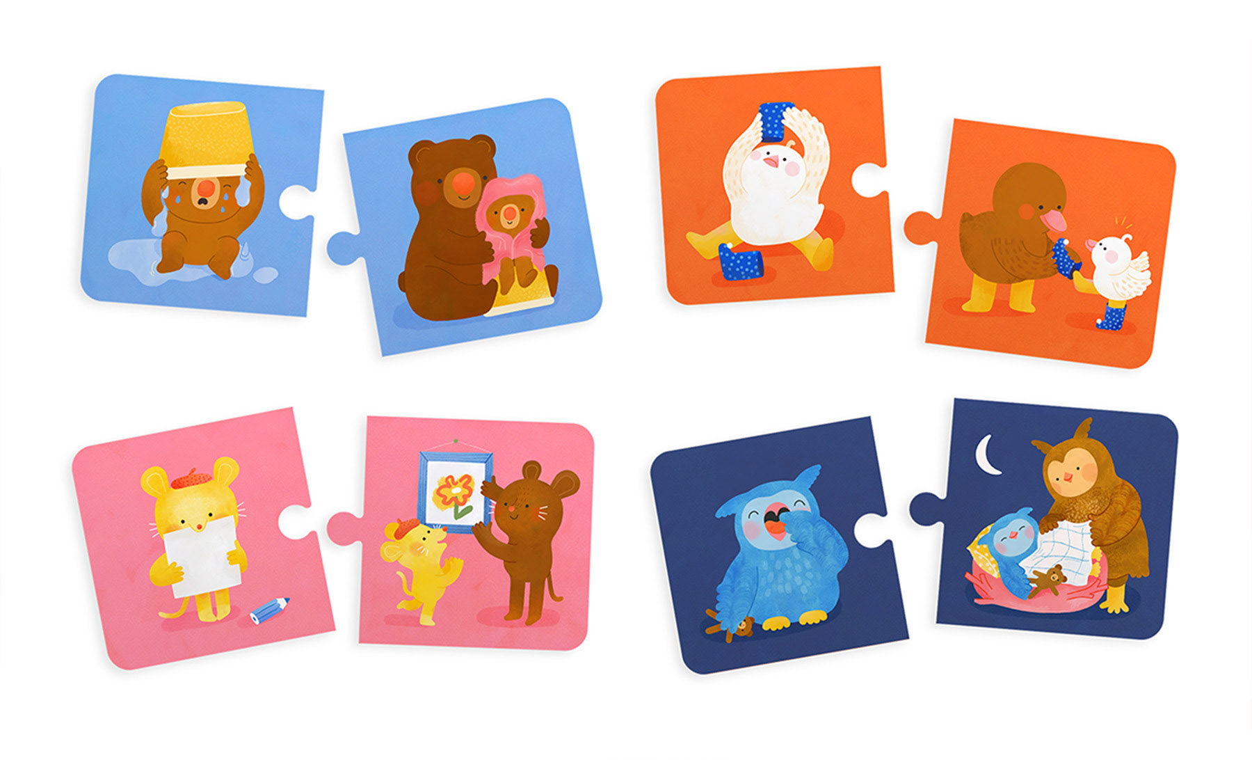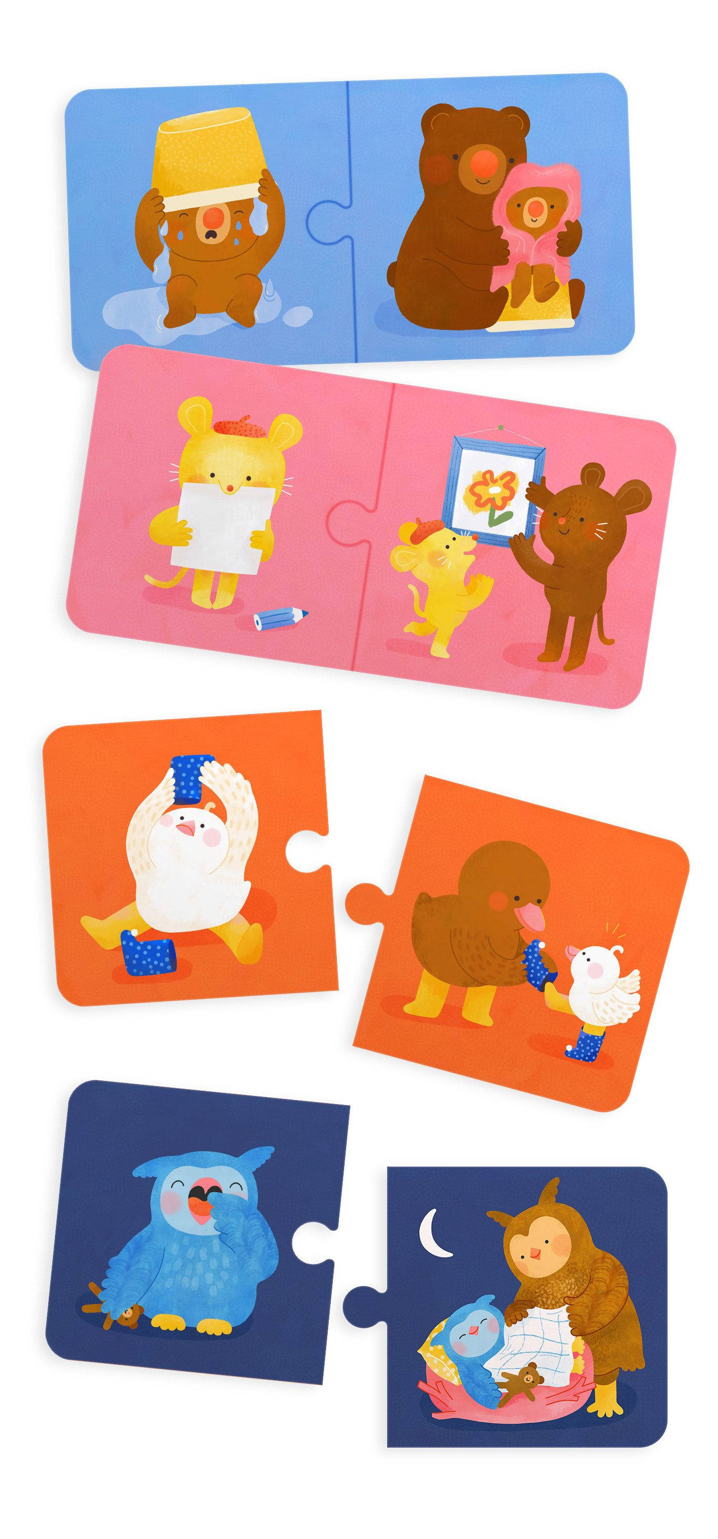 A collection of small stories told through a set of four matching puzzles. Each pair shows a baby animal experiencing big feelings like tiredness, shyness, doubt, or tears, and the caring parent who helps them through